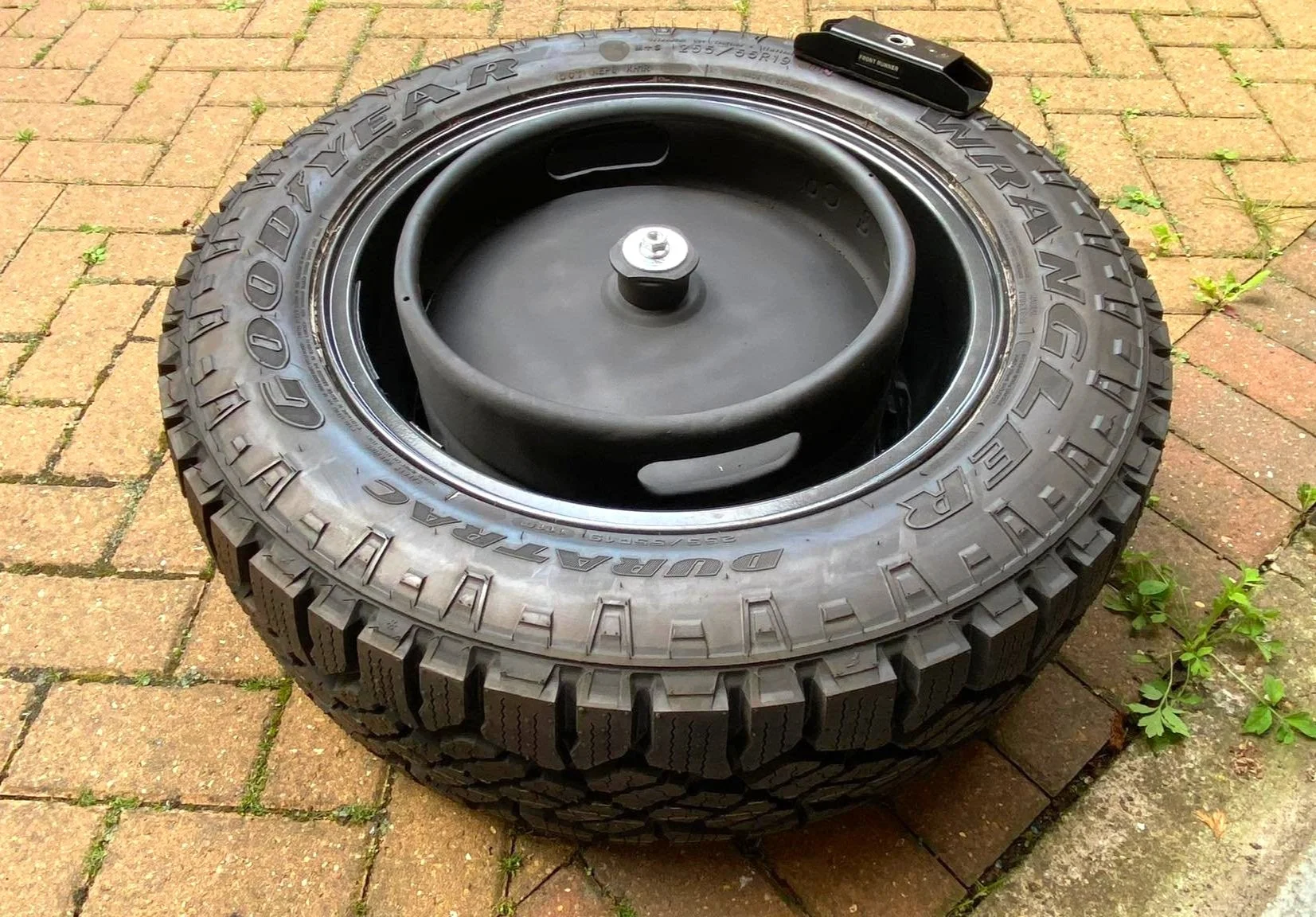 We also carry our 2nd spare on roof held by customised Front Runner bracket and inside of the wheel is hidden our firepit. Yes, it is made from half of stainless steel beer keg, and it works great. No unfolding and folding, stable and movable even with the fire on.