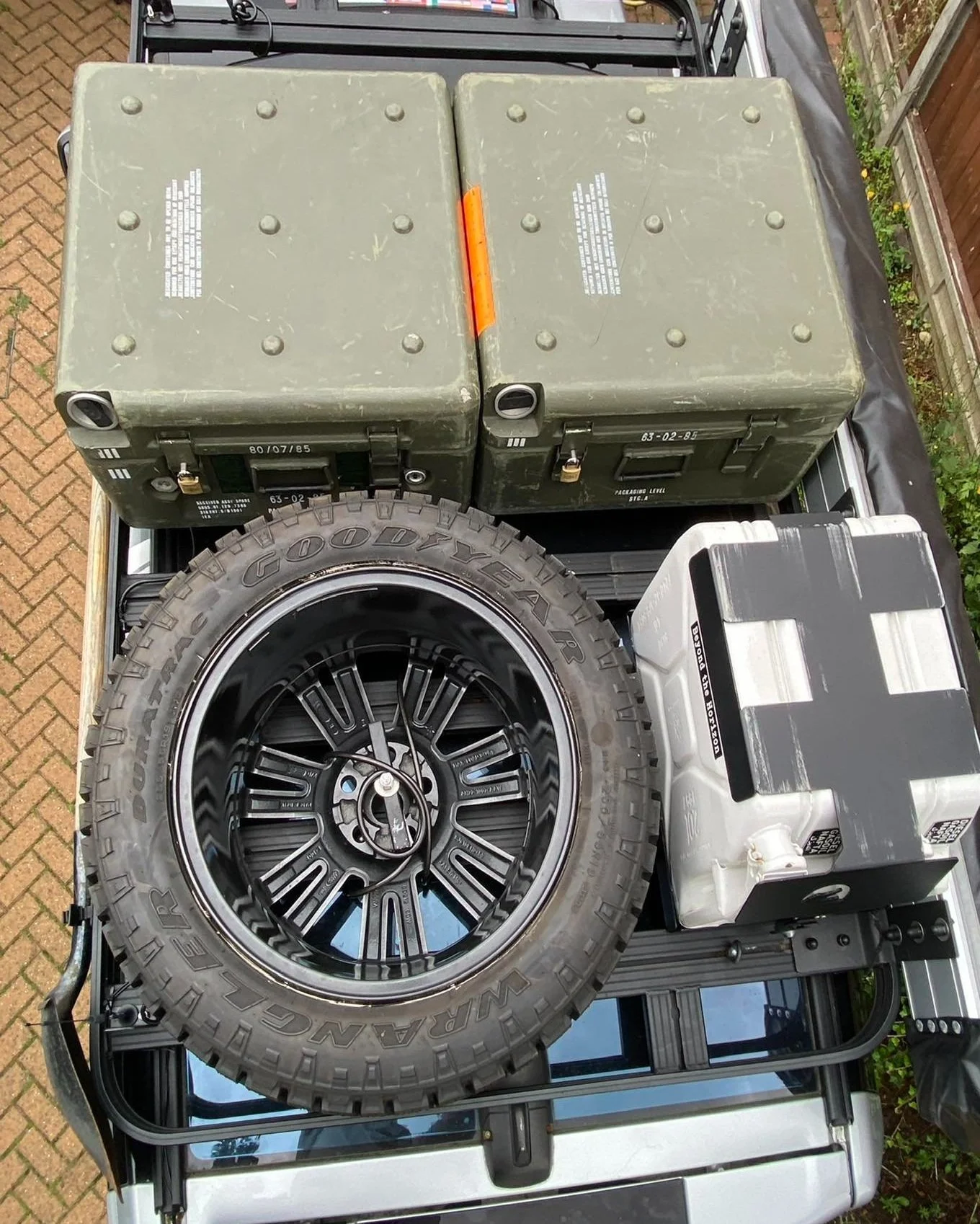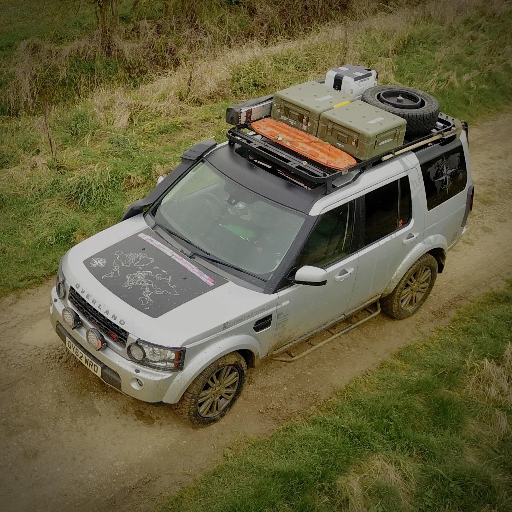 For storing our recovery gear, inflatable kayak and other bits we use ex-army boxes. They are sturdy (you can walk on them), water and dust proof, and have lockable latches. As they are 60 x 60 cm they fit perfectly on 120cm wide roof rack.