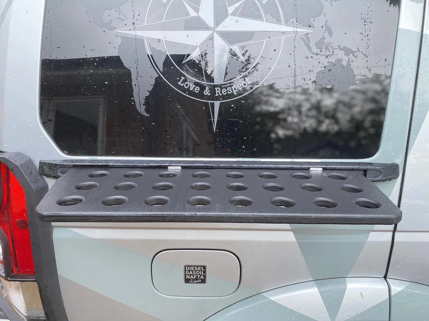 To the rear part of vehicle dominates Prospeed ladder. With that extra step in lower loop, it is the most usable and comfortable (and probably safe) ladder for Discovery to us. Also it has flat step on top which gives you extra stability before steping on rack. And no, it doesn’t interfere with awning.