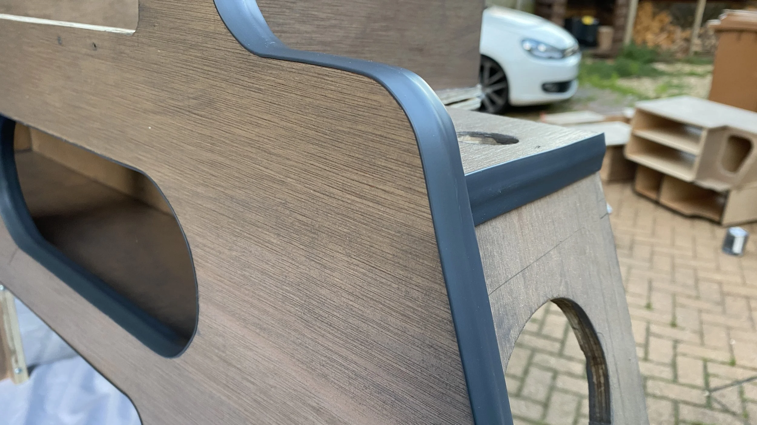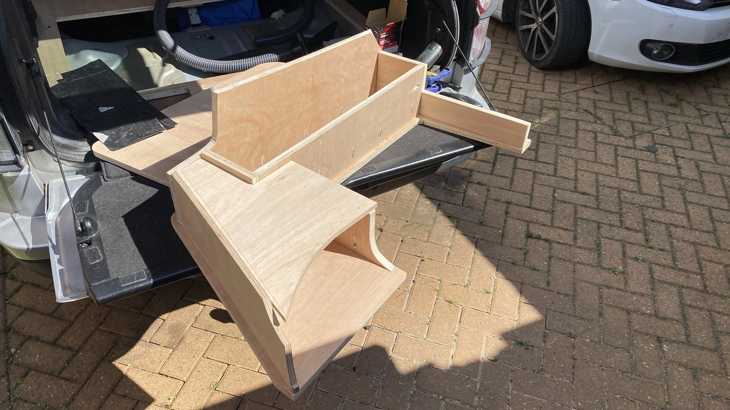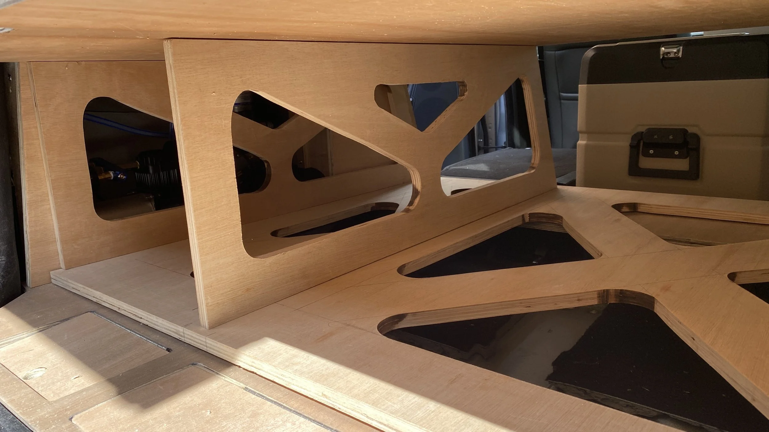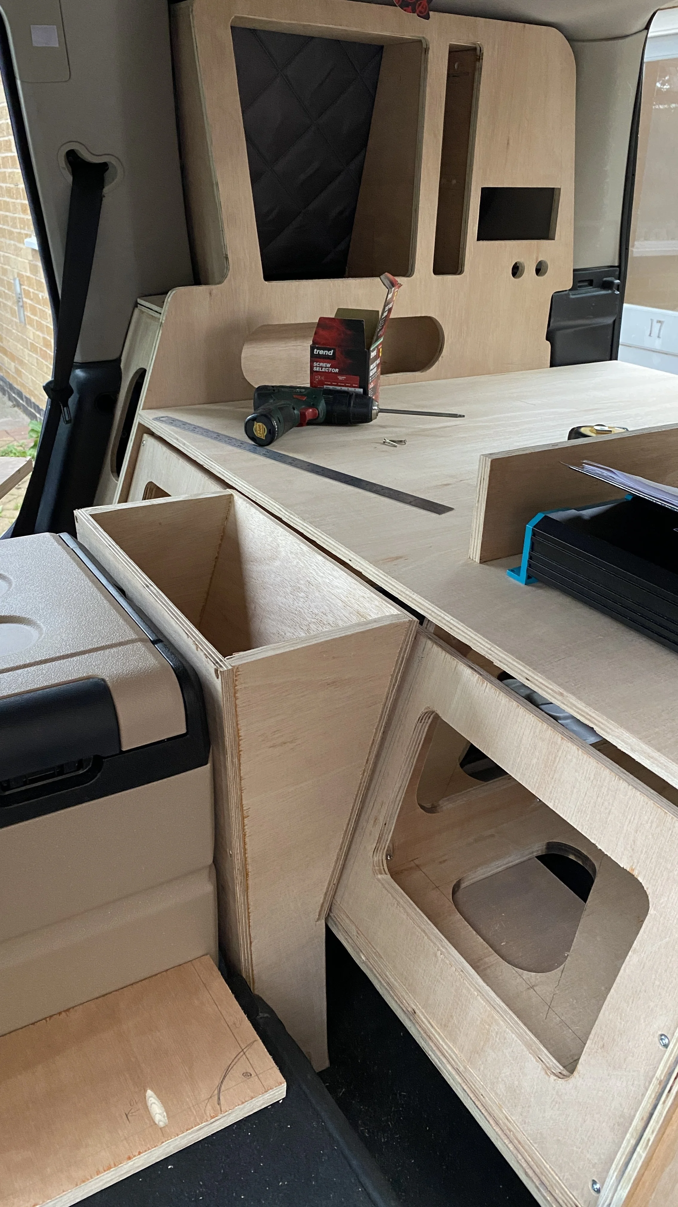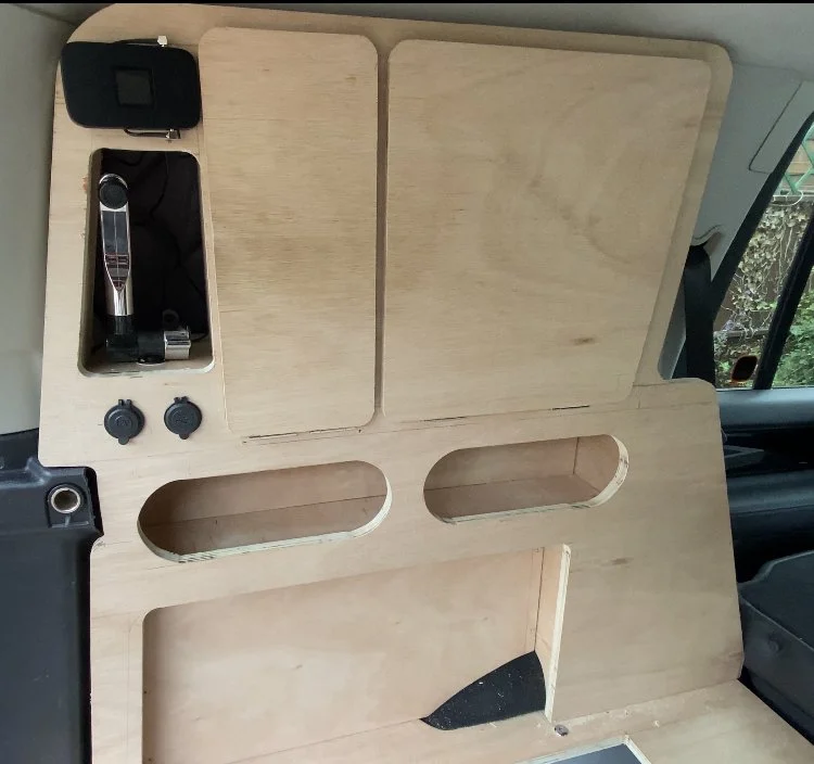 For the side storage areas, we initially planned to build simple cupboards from inside the boot windows, but quickly decided to use the space behind the plastic boot trims as well.