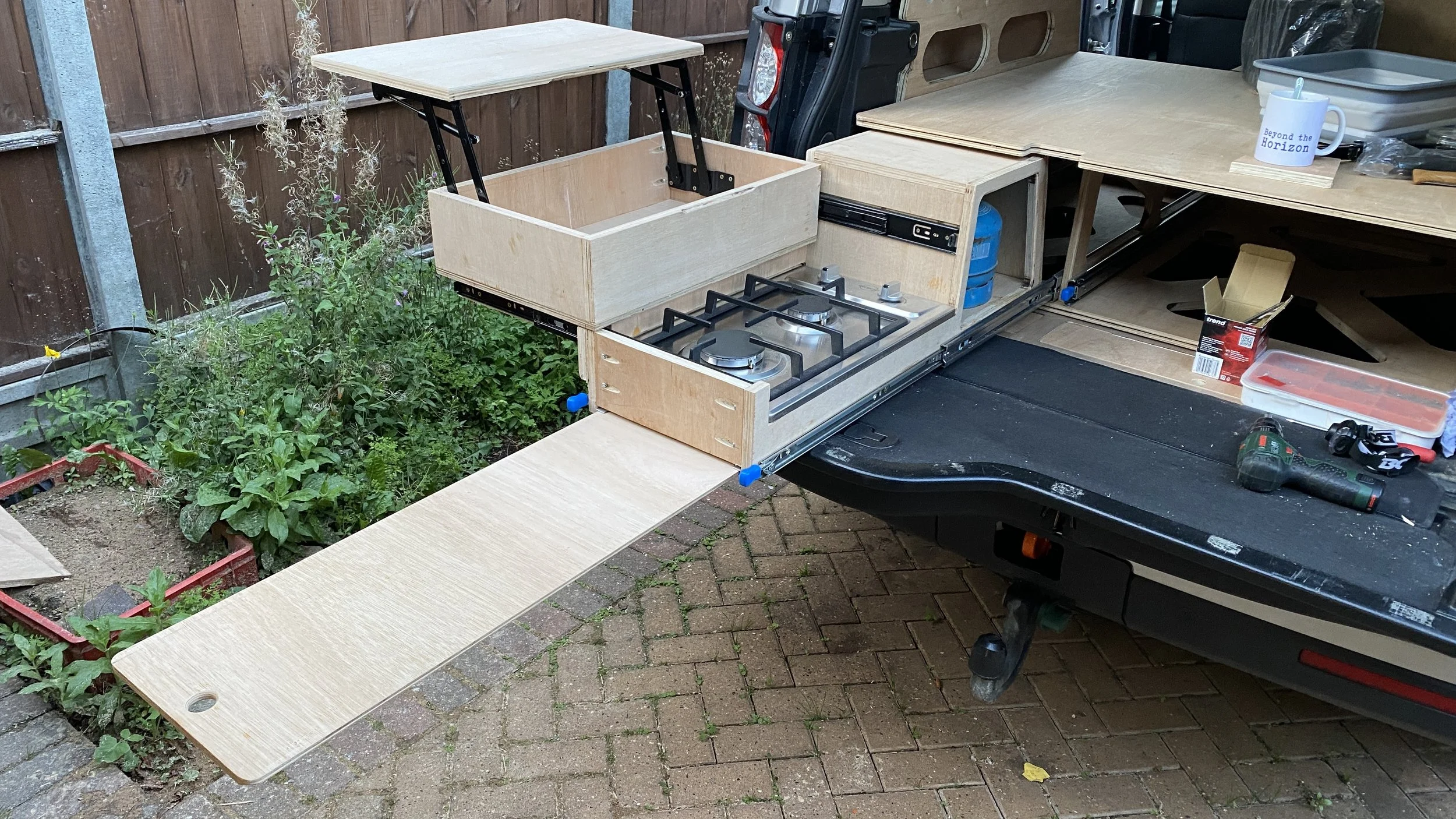 Below the platform, there had to be enough space for two drawers. First one for kitchen - housing the gas stove and gas bottle close to each other as we didn’t want long gas hoses running around the boot and risking kinks or pinches. And thanks to that whole kitchen draw can me easily taken out and used as kitchen elsewhere. It houses 2 gas burners, and slide out draw with spices and utensils and from under the kitchen unit we can slide another small table. Second drawer is used as a pantry and more storage. The kitchen drawer also couldn’t be too tall — when pulled out for cooking, we wanted to be able to close the upper tailgate to prevent cooking vapors and smells from entering the car, and to keep warmth inside during winter.