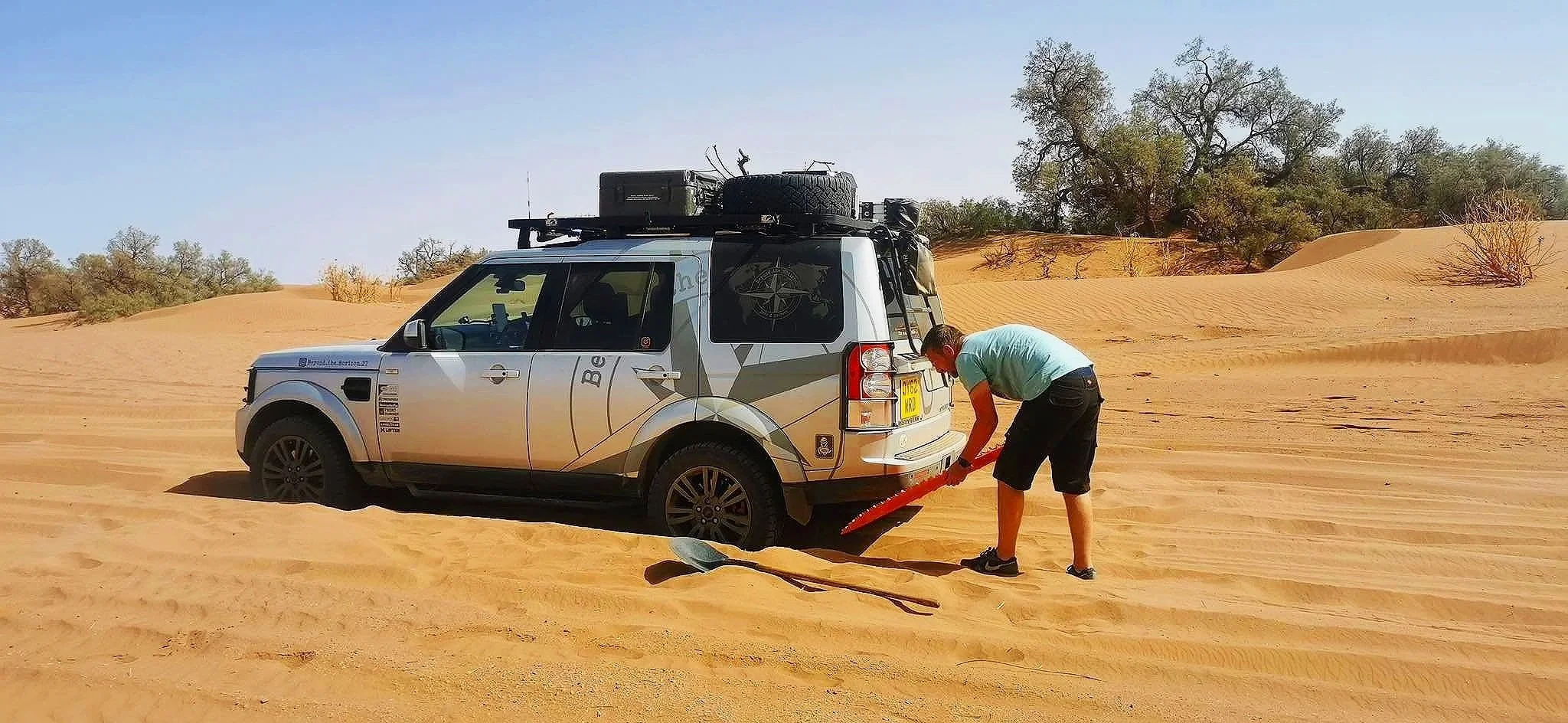 OK, we are finally stuck. Our first go-to tool is our trusty shovel. Clear whatever is around your wheels, chassis, (sand, snow, mud), lower tyre pressures more, etc. The second tool we reach for are our Maxtrax. We love them -simply because they work. There hasn't been a situation where they’ve failed us. We know they’re not the cheapest, but trust us - when you break some knock-offs from China in dunes 100 km from the nearest settlement, on your thousands-pound trip, you’ll think differently about those “saved” £100. There are much better areas of your build where you can save money - but not on one of the few ways you can recover yourself.