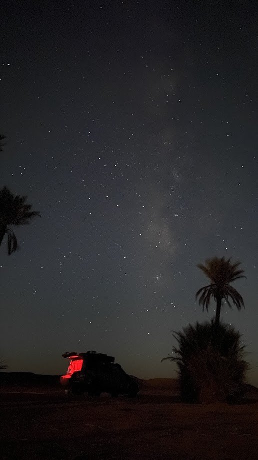 Of course, we had to drive to the top and enjoy the stunning views. Later we parked at the bottom under a tree for a refreshing lunch before driving around the formation from the outside to look for a camp spot. We chose a small palm grove nearby and spent the night there, enjoying the incredible view of the Milky Way.