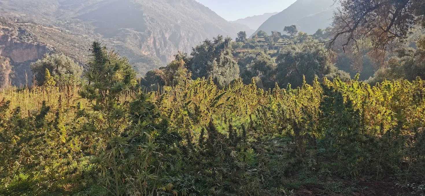 Driving through the Rif Mountains, following remote tracks and passing through small villages rarely visited by outsiders. The route eventually led to a dead-end road in a quiet settlement surrounded by cannabis plantations, with plants drying openly on rooftops and around the houses. Locals watched us with smiles and curiosity as we carefully turned around and made our way back.
